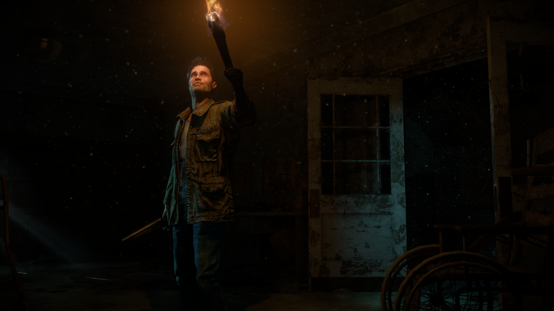 Up the stairs in this room, there will be a hole to drop down into one of the locked rooms. Mike will pick up a torch and a shotgun. On the opposite side of the main room, a door on the far right will lead outside, where Mike can find a makeshift graveyard.