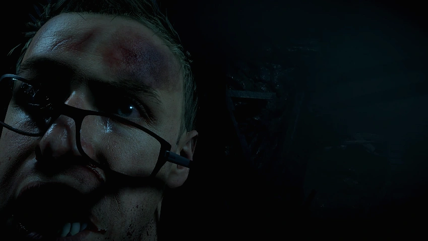 After shooting the lock off the middle door, Mike will step through to reunite with the wolf from an earlier chapter. If Mike kicked him and did not give him the bone, Wolfie will only bark and run away. But if Mike befriended him, Wolfie will be here to protect Mike and guide him around the Sanatorium. With a new friend to lead the way, Mike will head outside and enter another building. Once you open the door and squeeze through, Mike will come across the remains of another wolf. The room on the left has writing scratched into the wall, and significant dents on the heavy steel door. Down the right corridor, follow the linear path through the broken wall at the end.