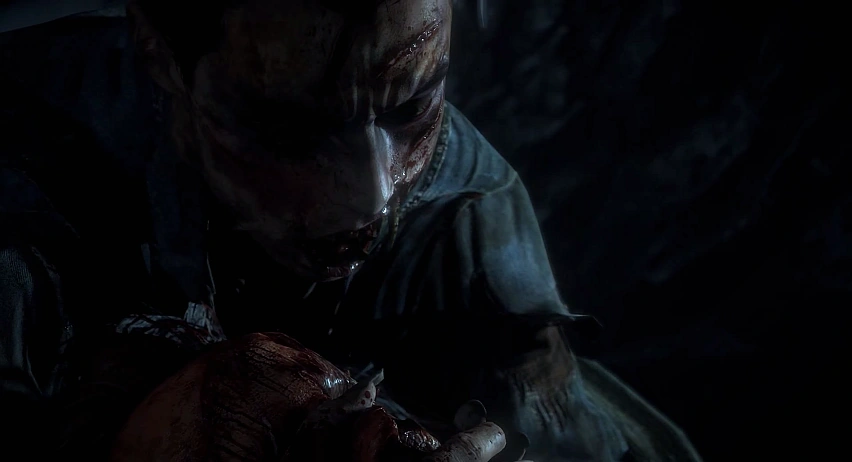 The camera cuts between longer shots of the mines and quicker shots of Josh gnawing on something. He is visibly in the process of transforming into a Wendigo. The camera will then pan to reveal that Josh is eating the decapitated head of the Stranger. Eventually, Josh looks up, towards the camera.
