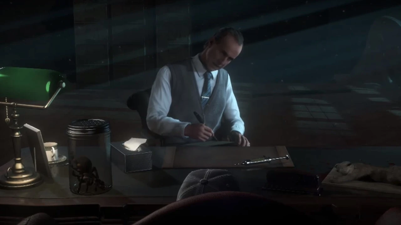 Dr. Hill is once again standing by the window of his office. It is starting to become more noticeably decrepit, the walls have began to decay, rusty chains are seen hanging around, the window is now boarded with several planks of wood with a ripped curtain seen to the right side. The objects on his desk will also change to play on your fears.